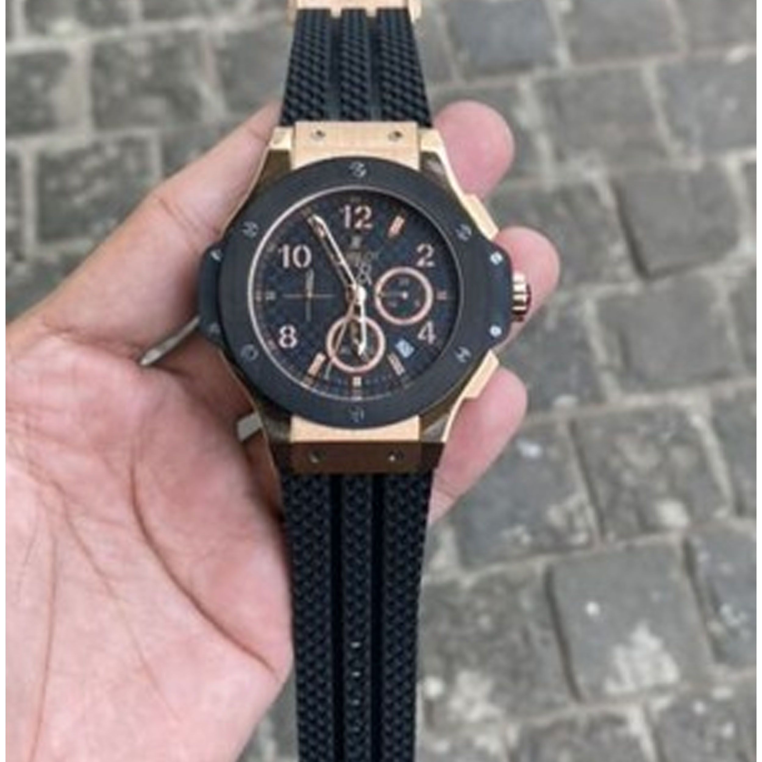 This timepiece boasts an intricate chronograph function, ensuring precision and accuracy. The contrasting elements of black and rose gold accents create a striking visual balance, appealing to both watch aficionados and casual wearers alike.